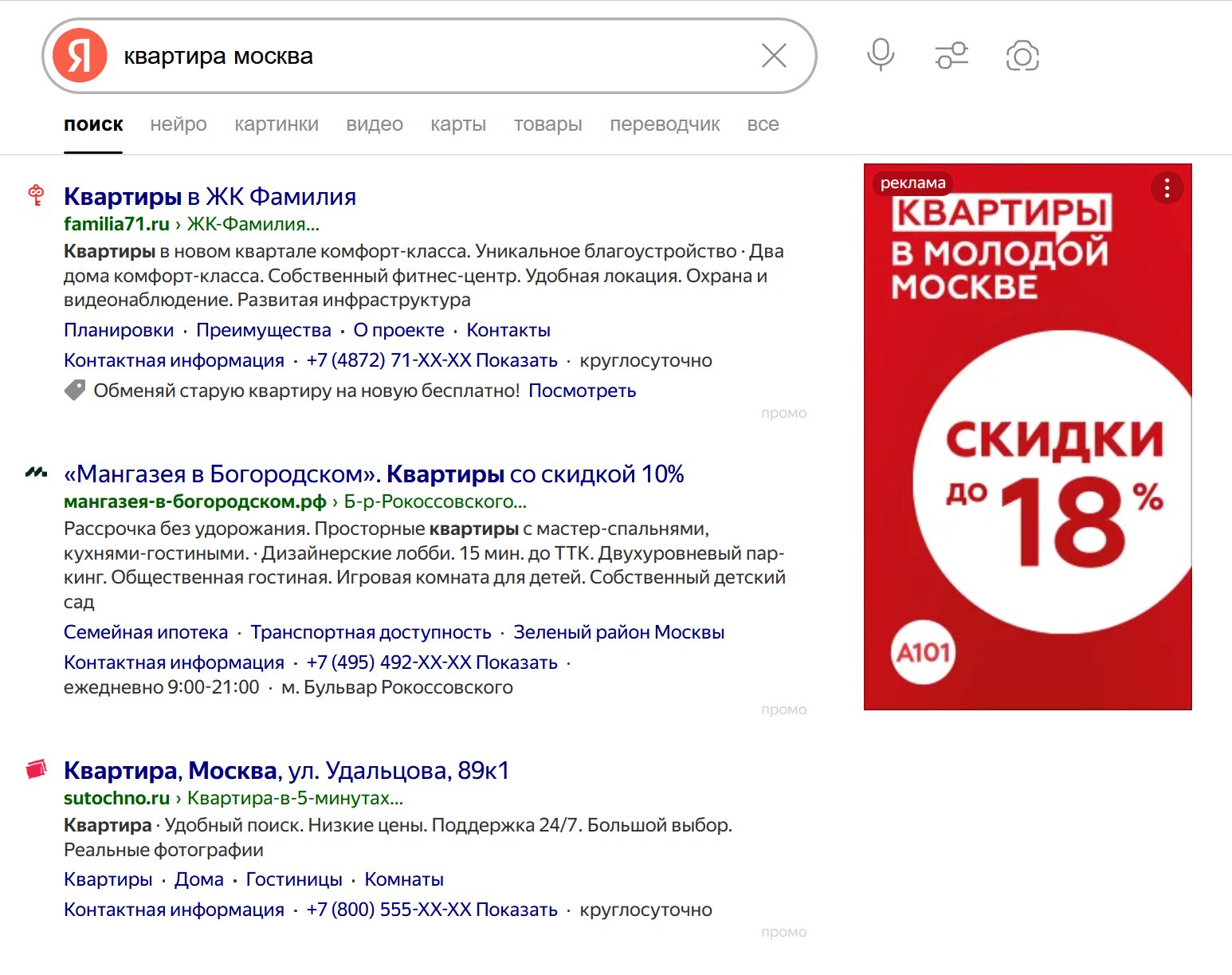 В поиске — это ссылки на первой странице выдачи. Пример: пользователь в Яндексе вводит в поисковую строку запрос «купить велосипед в москве» — первым делом он увидит ссылки и объявления магазинов, которые заплатили за показ. Этот вариант рекламы самый дорогой, но дает хорошие результаты